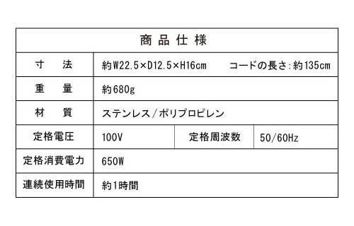 메이커 제품번호:MCE-3076;본체크기 : 약W22×D15.8×H12.4cm;본체 중량 : 약680g;소재 재질 : 스테인레스,폴리프로필렌;전원 방식 : AC100V~125V 50/60Hz;소비전력 : 650W