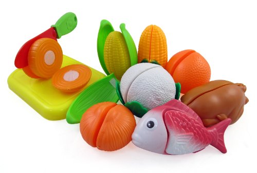 -. Feature : This colorful plastic vegetable set is a sure-fire way to teach kids to appreciate their veggies! / 8 play food items: cauliflower, onion, garlic, 2 corns, grapefruit, chicken, fish / Cutting board and plastic knife included / Vegetables can be pretend-peeled and sliced, then fit back together again with Velcro / Perfect for pretend play and introducing concepts of whole and part.