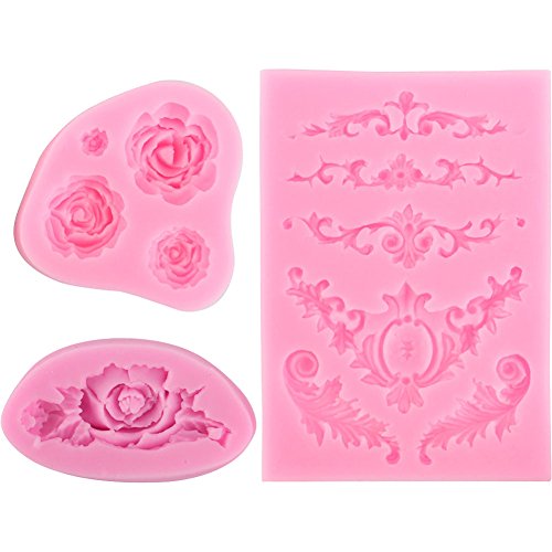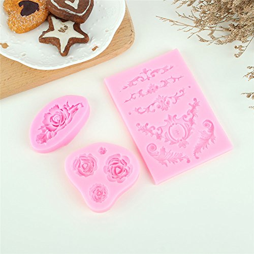 Scivokaval Sculpted Flower Lace and Rose Theme Silicone 3D Baking Chocolate Fondant Soap Candy Cake Decor Jelly Sugar Craft Gumpaste Pastry Clay Making Ice Cube Tray Fimo Casting Molds, Set of 3