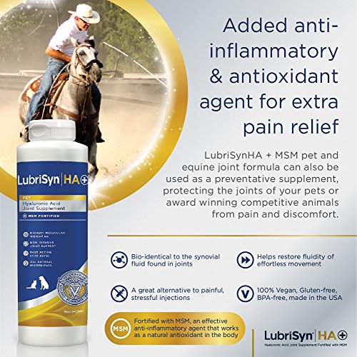 PROMOTE JOINT STRENGTH AND HEALTH: Advanced LubriSynHA + MSM is a powerful joint lubricant and anti-inflammatory for your feline, canine and equine companion, supporting hip and joint mobility and protecting the structural integrity of cartilage and connective tissues.