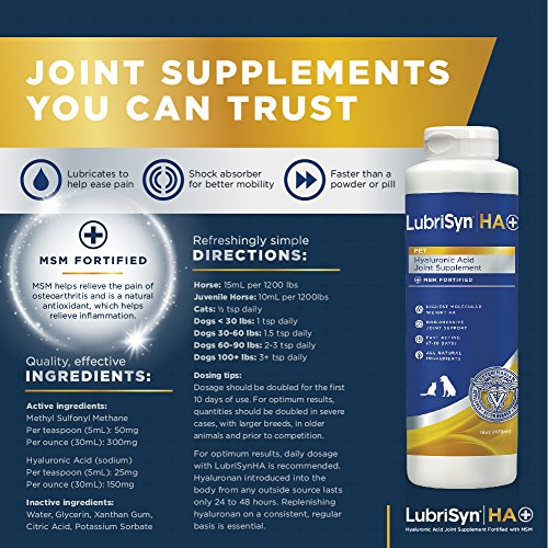 POWERFUL FORMULA FOR ANY PET: Lubrisyn HA + MSM Joint Supplement is intended for pets of all shapes and sizes; whether for preventative purposes - high-level performances, intense exercise and play - OR - mobility purposes, such as hip dysplasia, older pet arthritis or injury - our joint support liquid can be used for any small, medium or large dog, cat or horse.