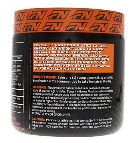 ReleaseDate : 2015-11-06 Studio : Formutech Nutrition Publisher : Formutech Nutrition Binding : Health and Beauty Product Description Level II super thermogenic comes in an easy-mix powder and its fruity grape flavor tastes fantastic. The powder delivery system in level ii exceeds outdated thermogenic products because it starts working faster to give you the added energy you need. Don't wait for pills or capsules to dissolve in your digestive system. Level II provides the most efficient and fastest absorption of any thermogenic on the market. 0