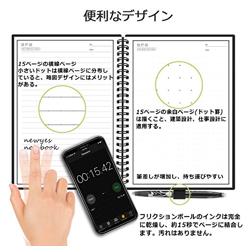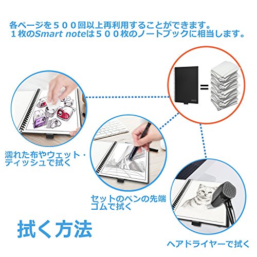 スマートノートは繰り返し使用可能なノートです、濡れた布で直接簡単に消せます。ドライヤーを使って熱風を吹かしてもいい、ノートに書かれていた文字が全部消えます。