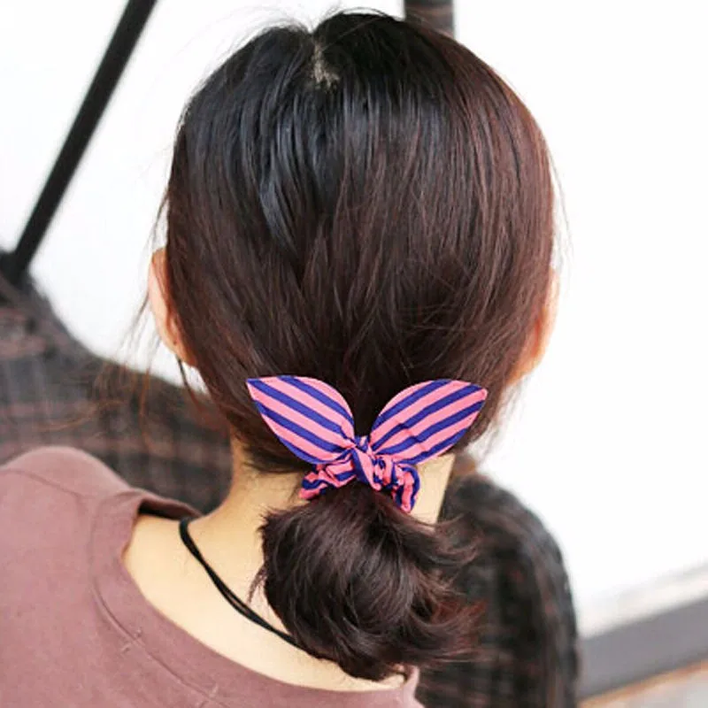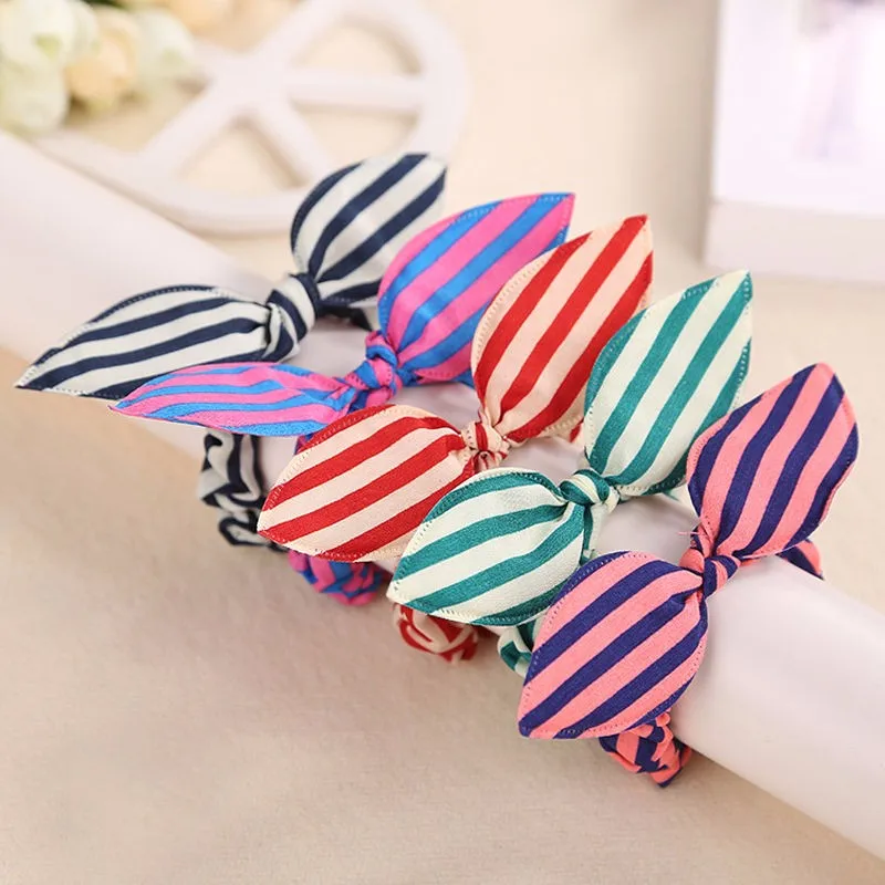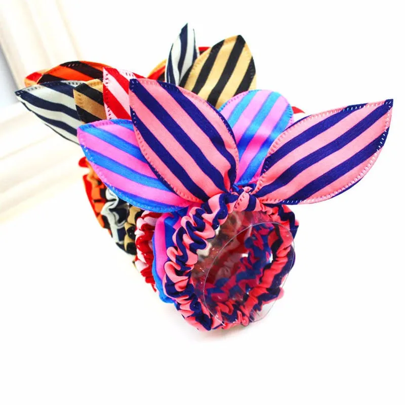 Fashion Stripe Scrunchies Hair Rope Elastic Bow Bunny Rabbit Ponytail Holder