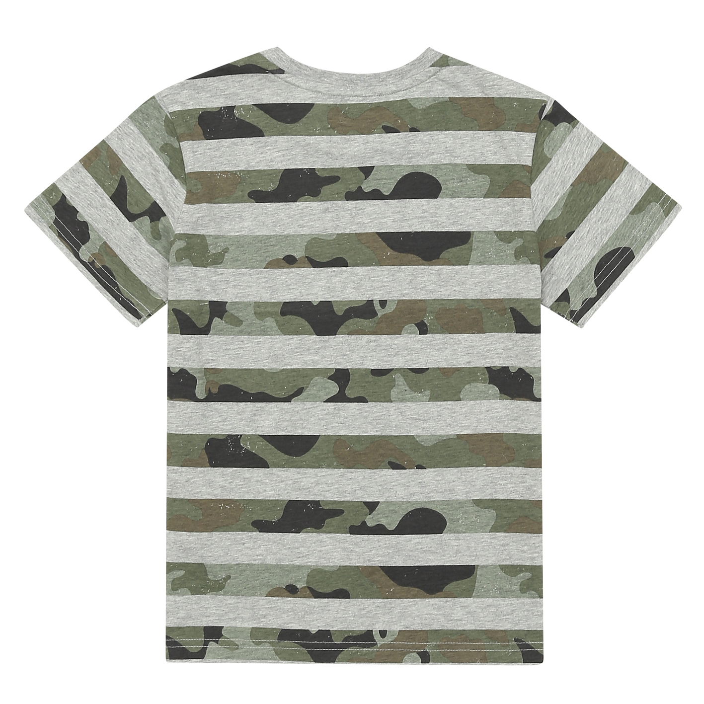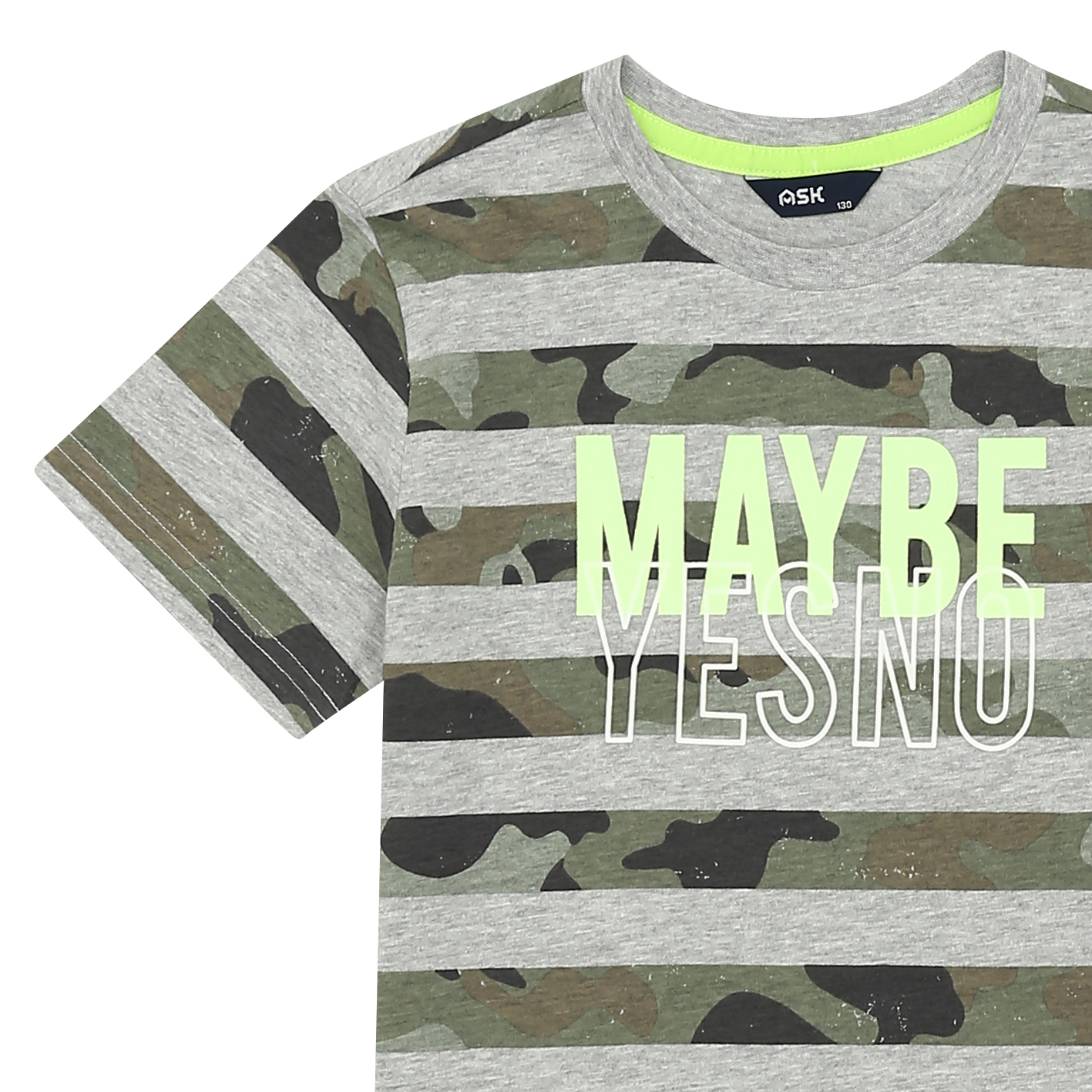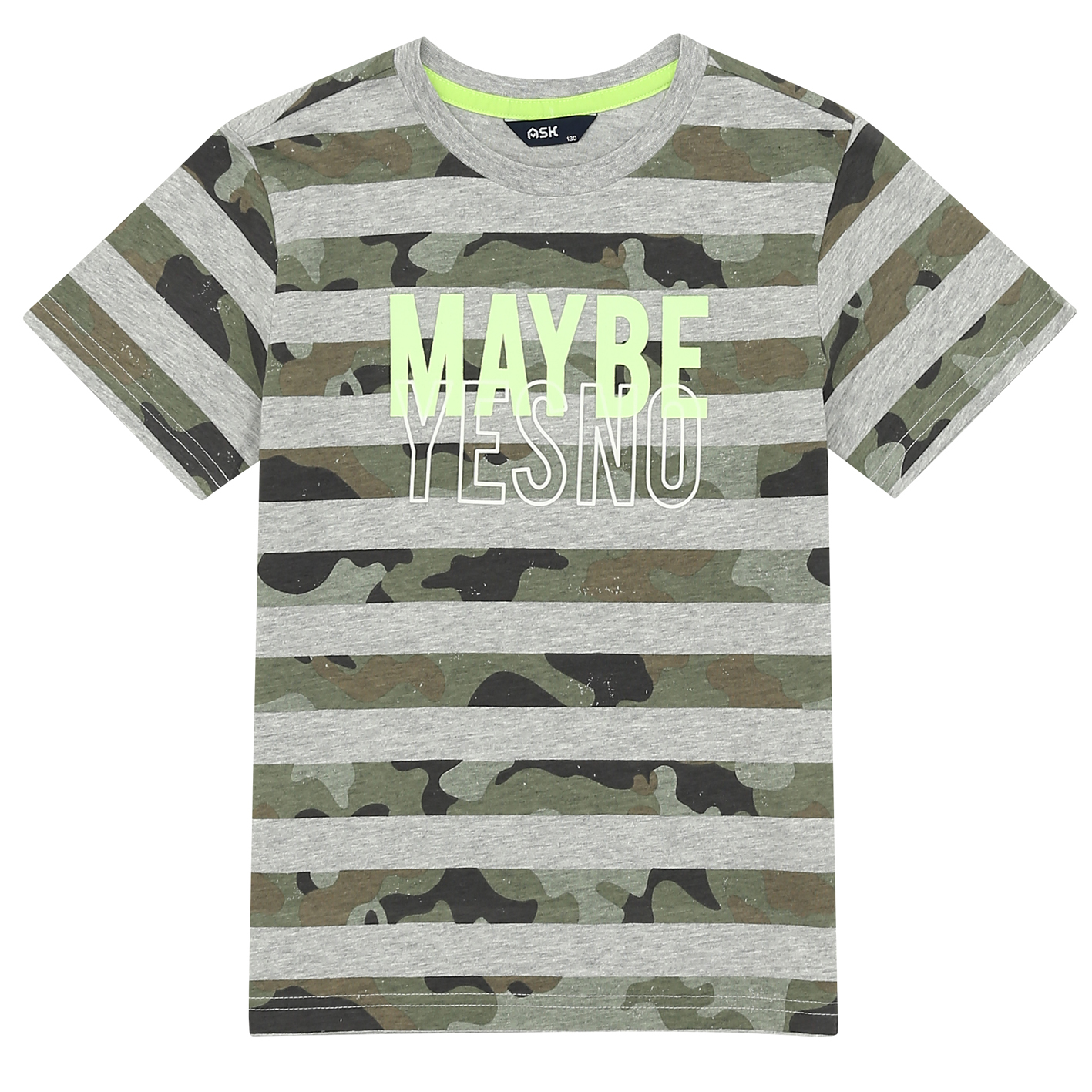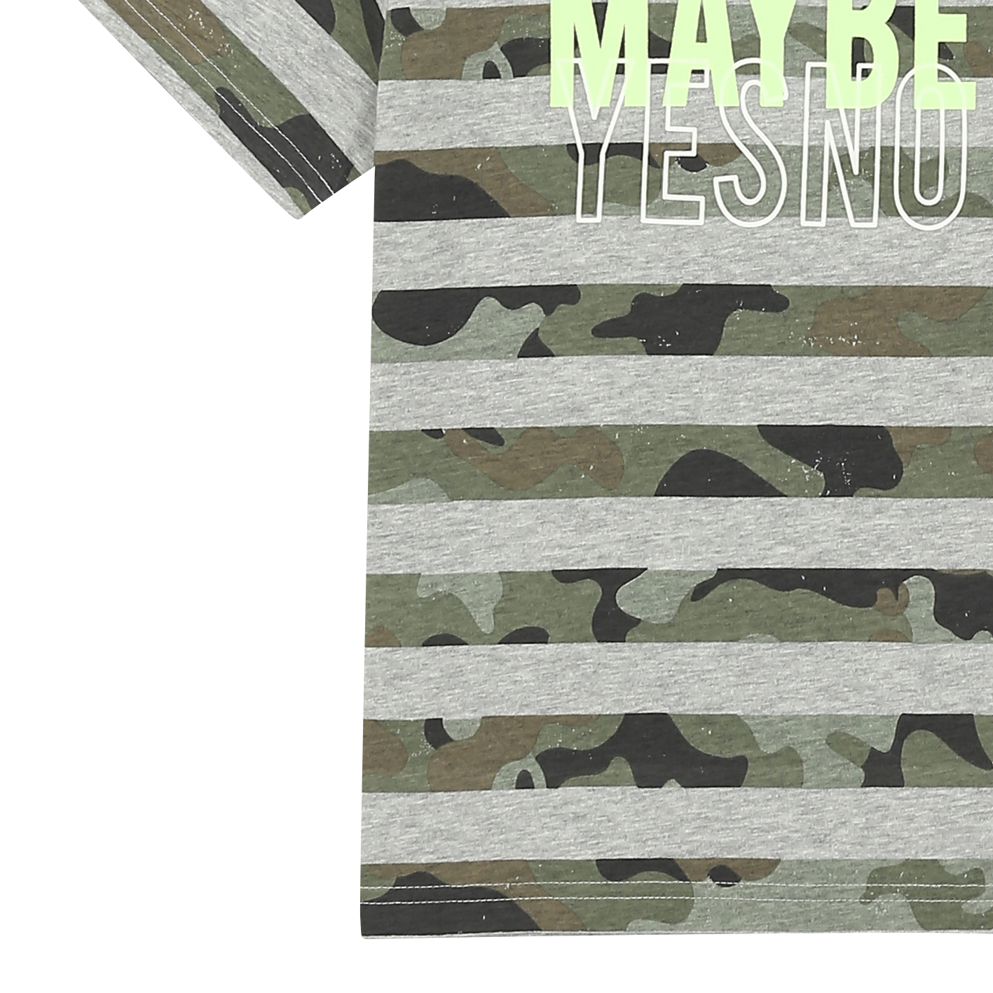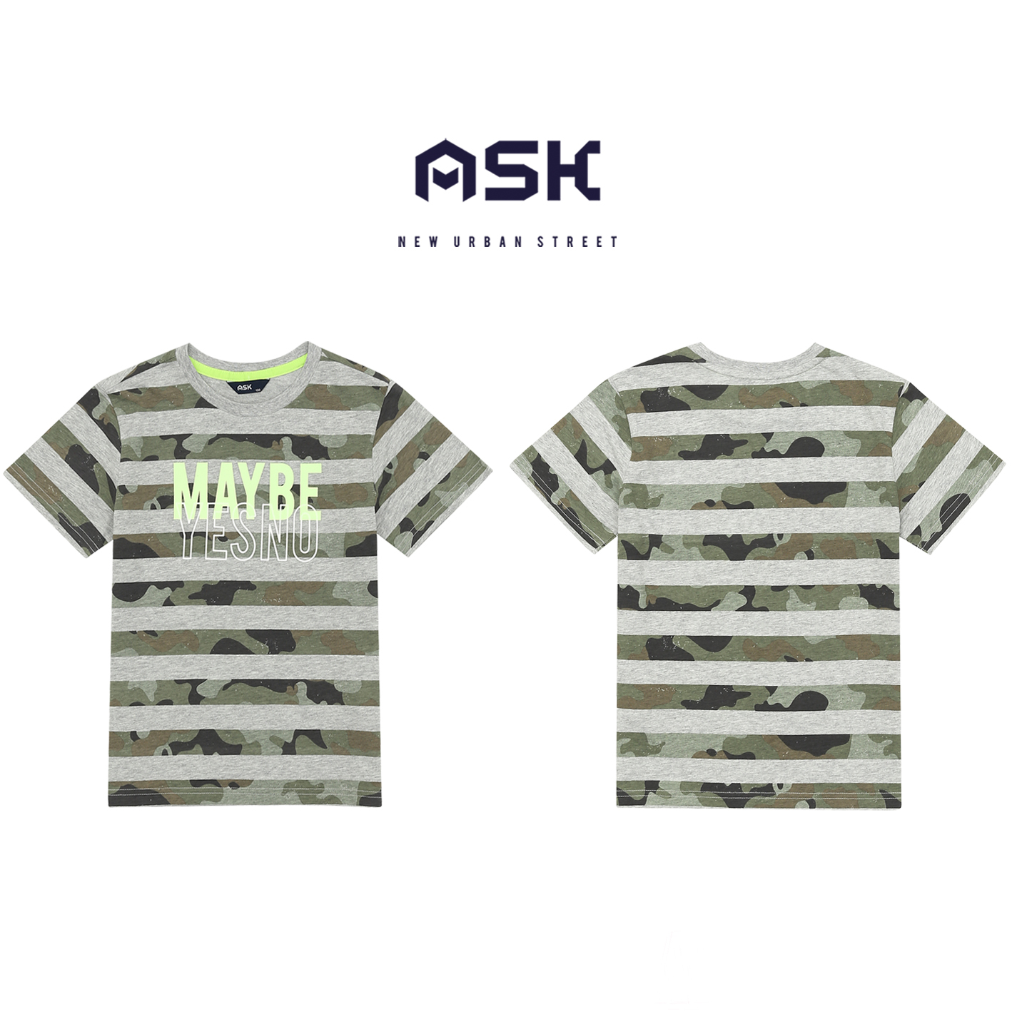 30수 싱글 소재의 기본 티셔츠. 기존 스트라이프와 다르게 스트라이프를 카모플라쥬 패턴으로 준 티셔츠. 가슴에 들어가는 아트웍에 밝은 yellow 칼라로 포인트를 준 아이템임.