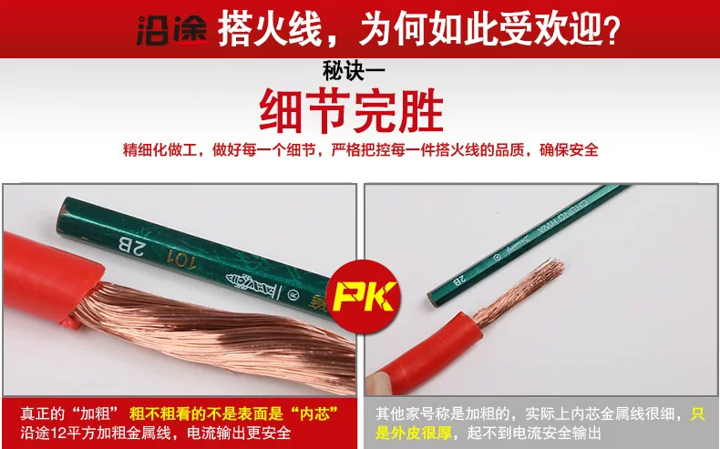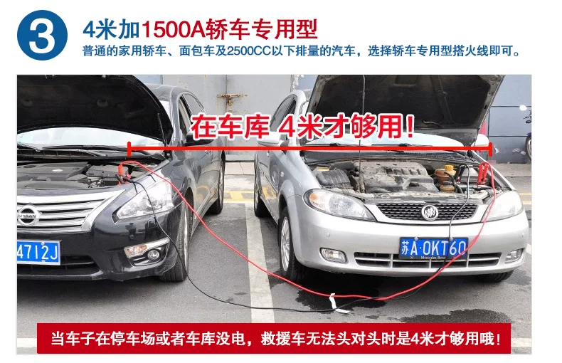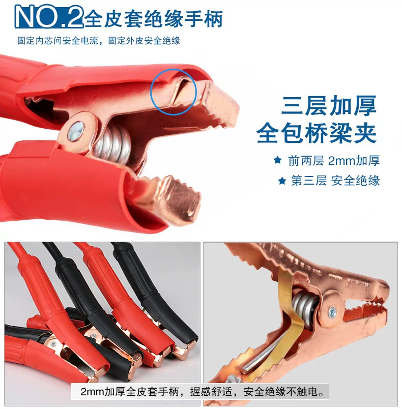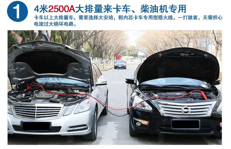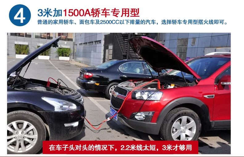 1 exclusive development with computer protection ride FireWire, stable car circuit protection devices 2. 4 M 1500A for 1.0-2.5 displacement cars van type. 3 Bold inner core, not just the skin of the line thickness, real guarantee high current output, the thicker the wire core security. 4 using the new ABS environmental protection material, non-toxic and tasteless safer. 5 copper alloy oversized metal battery clip, 2mm thick leather handle, secondary reinforcement design, safety insulation does not shock. 6 cold frost resistant, two cars a pick, a play on the need to wait, to help your car by emergency power.