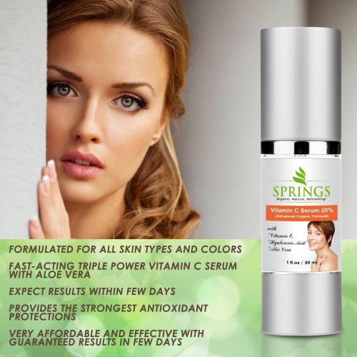 -. Binding : Misc. -. Brand : Springs Organic -. EAN : 0617395905096 -. Feature : GUARANTEED FAST ACTING-Vitamin C Serum for Face is Fast-acting Advanced Organic Formula. Expect Firming Effects within few days; Anti Wrinkle Effects Within few weeks and Facial Brightening Effects Without Spots in about 30 days. Works better than phytoceramide. Best vitamin C serum, vitamin C serum for face, vitamin C serum 20, vitamin C serum with hyaluronic acid, vitamin C serum in beauty, vitamin C serum organic, vitamin C serum for body, vitamin C serum in health and personal care.Now on sale, Black Friday Sales, Black Friday Sales Promotion, Black Friday Deals / POTENT ADVANCED EXCLUSIVE FORMULA: Vitamin C Serum for Face with Vitamin E, Hyaluronic Acid, Made with Advanced Vitamin C Serum Forms that Produce Quick and Lasting Face and Neck anti-wrinkle and Anti-Aging Effects Faster than any other forms of Vitamin C Serum for Face. Vitamin C serum, vitamin C serum for face, vitamin C serum 20, vitamin C serum in beauty, vitamin C serum in health and personal care, Vitamin C serum for face, best vitamin C serum, vitamin C serum hyaluronic acid / AFFORDABLE AND PROVEN TO WORK: Vitamin C Serum with Vitamin E and Hyaluronic Acid is Produced with the most Advanced Forms of Vitamin C, Vitamin E and Hyaluronic Acid Serum; Priced so Anyone Can Afford It. Vitamin C serum, vitamin C serum for face, vitamin C serum 20, phytoceramide, Best vitamin C serum, vitamin C serum in beauty, vitamin C serum in health and personal care, vitamin C serum hyaluronic acid, vitamin C serum for body, vitamin C serum, vitamin C serum with hyaluronic acid, vitamin C serum 20 percent. / PREMIUM, PURE AND SMOOTH ON THE SKIN: Vitamin C Serum Contains Purest Forms of Vitamin C Serum 20 Percent with Advanced Forms of Vitamin E and Hyaluronic Acid on Organic Based Serum.Vitamin C serum, Vitamin C Serum for face, Vitamin C serum 20, Best Vitamin C Serum, Vitamin C serum in health and personal care, Vitamin C serum in beauty, Vitamin C Serum for face, Vitamin C serum hyaluronic acid, vitamin C serum for body, phytoceramide, vitamin C Serum organic / GUARANTEED TO WORK or GET A 100% REFUND: Vitamin C Serum for Face with Vitamin E and Hyaluronic Acid Serum is Guaranteed to Produce the Desired Facial Firming, Anti-Wrinkles, Anti-Aging, Face Brightening, Dark Spot Diminishing and Smooth Facial Effects within 30 Days or You Get Full Refund. Works better than phytoceramide. Here are the powerful qualities of Springs Organic Vitamin C Serum, vitamin C serum for face, vitamin C serum 20 percent, Best Vitamin C serum, Vitamin C Serum for body, Vitamin C Serum in beauty, Vitamin C Serum hyaluronic acid, SPRINGS ORGANIC Vitamin C Serum is a fast-acting unique formula GUARANTEED to deliver results faster than any other Vitamin C Serum here on amazon. -. Label : Springs Organic -. Manufacturer : Springs Organic -. Model : SO-AL-20 -. MPN : SO-AL-20 -. NumberOfItems : 1 -. PackageQuantity : 1 -. PartNumber : SO-AL-20 -. ProductGroup : Beauty -. ProductTypeName : BEAUTY -. Publisher : Springs Organic -. Studio : Springs Organic -. Title : Springs Organic® Vitamin C Serum For Your Face - Vitamin C Serum|Organic Vitamin C + Vitamin E + Aloe Vera + Hyaluronic Acid Serum- Effective Strength 20% Vitamin C Serum with Vegan Hyaluronic Acid Leaves Your Skin Radiant & More Beautiful By Neutralizing Free Radicals. This Anti Aging Antiwrinkles Serum Will Give You The Results in few days or we refund You With No-Question-Asked. Your 100% Satisfaction GUARANTEED! -. UPC : 617395905096