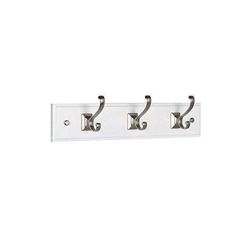 Wall Mounted Coat Rack and Hook Rail - 3 Hooks Vellum Design. White Wood & Satin Nickel