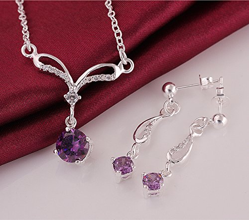 -. Feature : ♥Specification♥ Material: Alloy & Zircon, silver-plated. Zircon Color: Purple & White. Jewelry Set Contains: 1 x Necklace & 1 x pair Earrings. Necklace Chain Length: 17.72 + 1.97 inches. / ♥Love On the Mississippi River♥ The pendant of Necklace is like the lovely flower bud representing SP.R.Ing's Coming and the tree of your love beginning to sprout. The Pair of Earrings are like a couple of lovers encountering on the Mississippi River and falling in love. Very Romantic and Sweet gift for your beloved. / ♥Elegant & Stylish Jewelry Collection♥ Charming look with Sparkling Zircon charms, elegant and attractive, enhances you with a feminine and elegant touch. Wear yours and add a sophisticated finishing touch to your daily look. / ♥Ideal Gift Choice♥ Comes in a Jewelry Gift Box, no gift-wrapping needed. Perfect for her on Birthday, Wedding Anniversary, Valentine's Day, Christmas Day, Mother's Day, or any special day. Great gift for Mom, teen girls, and women. / ♥Perfect Customer Services♥Ophanie is committed to providing the best products and the best services to our customers. Please feel free to contact us if you are unsatisfied with the item or have any problem. We will assist you in finding a solution promptly! Your feedback is our motivations to improve. Look forward to your 5 star review!