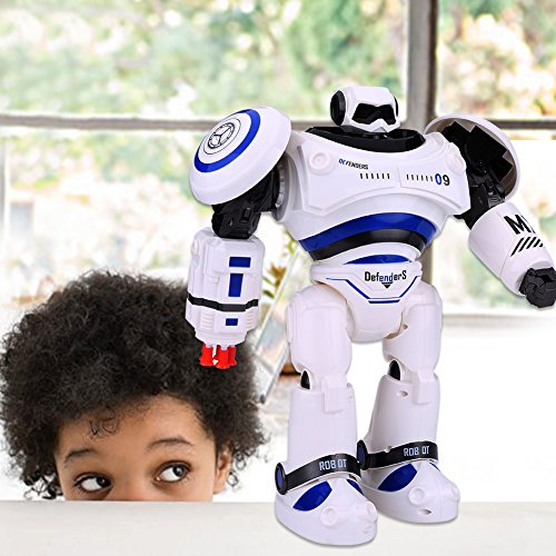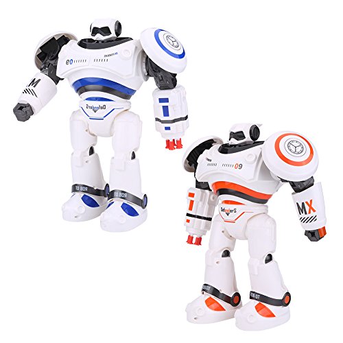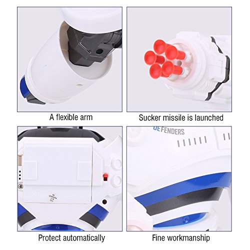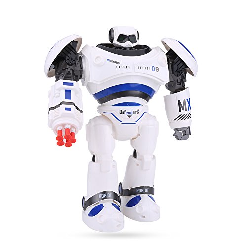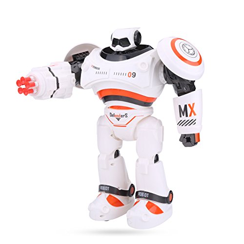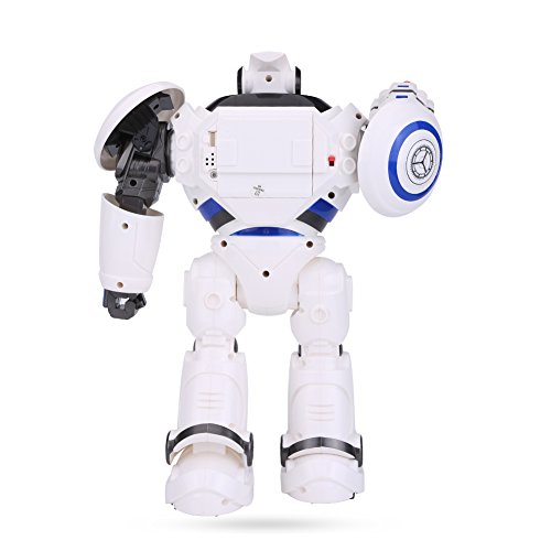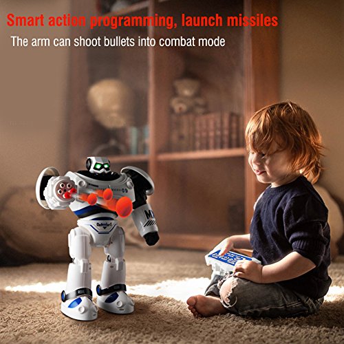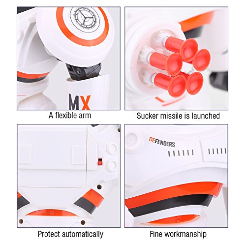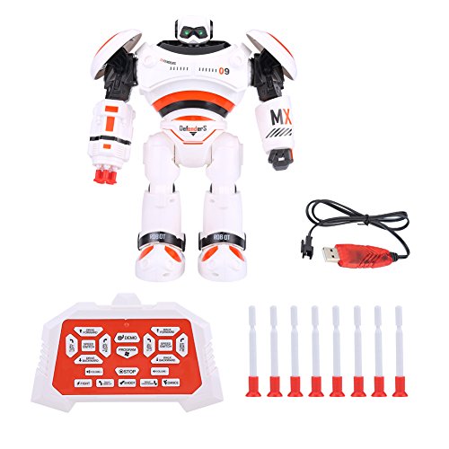 -. Feature : BEST GIFT: This robot toy is a very playful and multi-functional companion, which can do dancing, lighting and shooting stick sucker bullets. / REMOTE CONTROLL: Through infrared receiver, you can use the remote controller to command it to do what you want within reasonable limits. / 2 MOVEMENT TYPES: Walking and Sliding Mode for going forward / backward, turning left / right at the command of the user.The flexible arms make the control robot more realistic. / SELF- PROGRAMMING: You can also use the remote controller to program the robot to do whatever you want ther robot to do within reasonable range. / GUARANTEE: If you are not satisfied with our product received, you can apply for unconditional return and refund in 180 days. In terms of any problem of this product, you can send emails to us at any time. We will reply you soon.