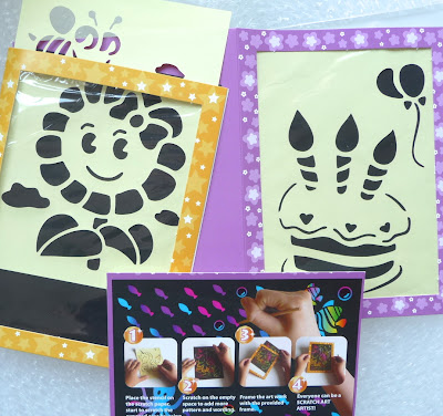 Scratch art kit for kids' do-it-yourself handicraft is simply enjoyable and very easy to make! Kids will just have to enjoy scratching the black surface with the provided wooden stick and design in paper stencils and reveal beautiful rainbow-like colors underneath! After completing, simply scratch your own wordings to personalize craft.
