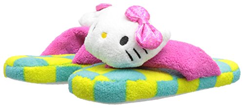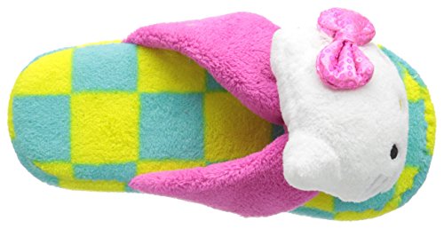 Hello Kitty Women's Plush Checkered Thong Slipper with 3D Head and Sequin Bow, Citron/Turquoise, Small (5/6)