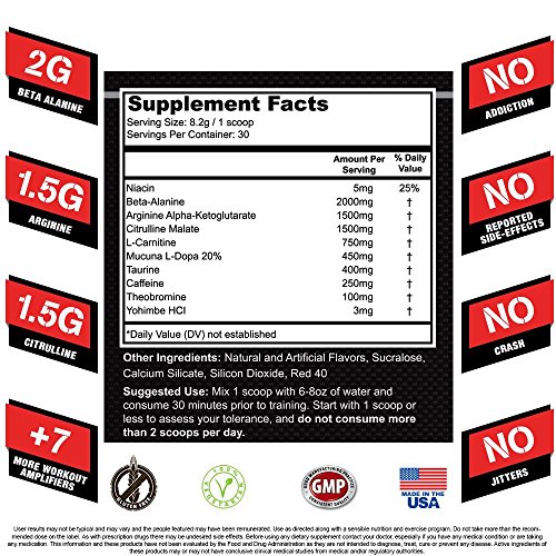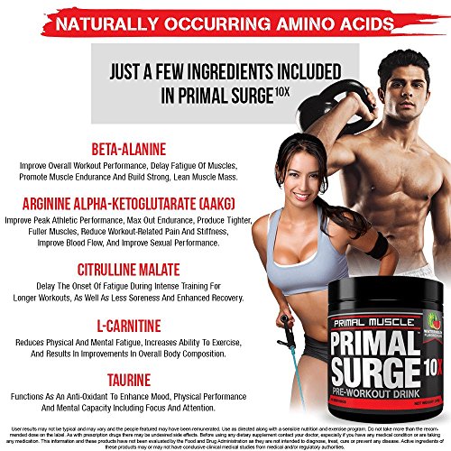 -. Feature : VOTED BEST NITRIC OXIDE PRE WORKOUT. Feel The SURGE - smooth & sustainable pre-workout energy with no crash or jitters - users report non habit forming. / PRE WORKOUT ENERGY FOR BOTH MEN & WOMEN. P.R.Imal SURGE does not contain anything illegal, or "hormonal" unlike other pre-workout drinks on the market - it was designed for men & women. / POWERFUL PRE WORKOUT FOR BUILDING MUSCLE. Max out intensity and dig deep to bang out rep after rep with ease. / EFFECTIVE PRE WORKOUT FOR WEIGHT LOSS. Burn more energy with every workout and get ripped - FAST! / MADE IN THE USA. Produced in a GMP-certified facility to ensure quality and potency. You don't skimp on your workouts, and we don't skimp on our ingredients - RESULTS GUARANTEED!