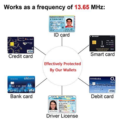 Our wallets are designed to shield all the contactless credit cards, passports, enhanced drivers licenses, that operate at 13.56 MHz and above. Generally Only the new 13.56 MHz contactless cards contain sensitive personal data,which could be shielded and protected by our wallet from reading by scanners and electronic pick pocketing.