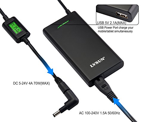 VERSATILE, READABLE AND SAFE. Use our laptop charger power up your laptop, charge its battery and tablet/mobile simultaneously. LCD shows DC & USB output voltage. Self-adjust current prevent over charging, over voltage and overheating.