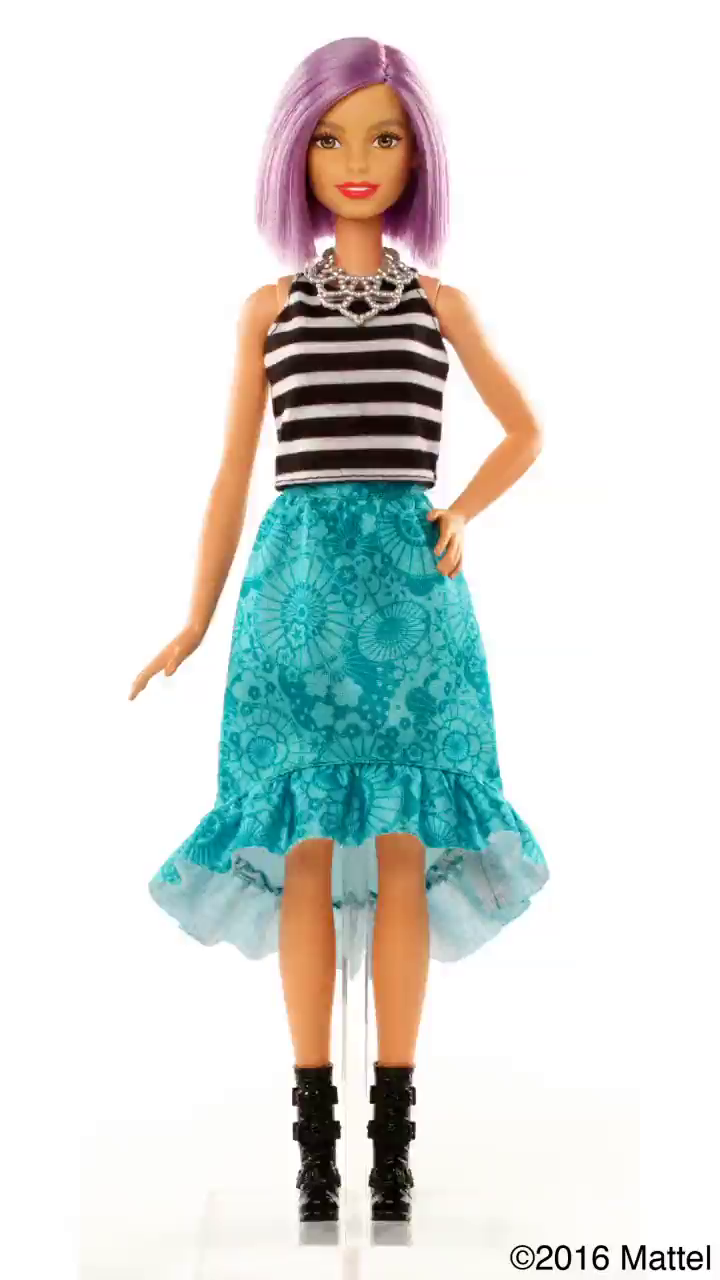 - Barbie Fashionistas doll is trendy pairing a black and white striped top with shimmery blue print skirt.