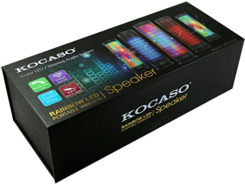 -. Binding : Electronics -. Brand : Kocaso -. Color : Black -. Feature : LIGHT UP LED SPEAKER - Sensational Bluetooth speaker with iridescent rainbow LEDs that flicker in time to the music. Rechargeable and wireless, you can bring the party with you wherever you go! / EASILY PORTABLE AND HIGH QUALITY SOUND - At just over a pound, this speaker is super portable without sacrificing sound. Excellent sound quality, you'll get deep bass and full tone for you to enjoy with others and yourself. / BLUETOOTH - Built with Bluetooth supporting wireless connection with all your bluetooth devices, and also has a MicroSD slot and 3.5mm audio jack (cable included) so you can listen to music even from wired devices. Use it with your computer, tablet, smartphone, or MP3 player. / MULTIPLE RAINBOW LIGHTING MODES - Features different lighting modes, from leisurely to lively, so you can find the right pairing for your tunes. All control buttons are placed easily at the base of the speaker for effortless operation. / HIGH CAPACITY BATTERY - High-capacity battery plays music for up to 4 hours, and the Bluetooth has a 10-meter range so you can move around the party without worrying about losing the connection. -. IsEligibleForTradeIn : 1 -. Label : KOCASO -. Manufacturer : KOCASO -. Model : T635 -. MPN : 6.16043E+11 -. PackageQuantity : 1 -. PartNumber : 6.16043E+11 -. ProductGroup : CE -. ProductTypeName : PHONE_ACCESSORY -. Publisher : KOCASO -. Studio : KOCASO -. Title : KOCASO [Portable] Bluetooth 4.0 [LED] Rainbow Dancing [Wireless Speaker] Hands-Free Calling, Built in Mic [Heavy Bass] For iPhone 7/6s/6 Galaxy S7/S6/S5 HTC LG Laptop Windows Android Smartphone- Black