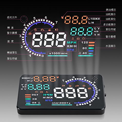 -. Feature : Display rich content: speed, engine speed, water temperature, battery voltage, instantaneous fuel consumption, average fuel consumption, mileage measurement, shift reminding, fatigue driving reminding, low voltage alarm, high temperature alarm, speed alarm, engine fault alarm, fault code elimination, free switching between kilometer and mile / Come with a HD Image Reflector, makes the display reflect image very clearly even in poor lighting condition or bright sunlight / New function:driving mileage measurement;The use of nano-technology to eliminate unwanted reflections and can make display information more sharper / Automatic and manual brightness adjustment mode, driving without glare;Auto power on and off with vehicle started and shutdown, effective protection of the car battery; while retaining the manual switch mode, and more beneficial to control HUD / 5.5" large screen and high-definition display;Multi-color design makes the screen more abundant and easier to read