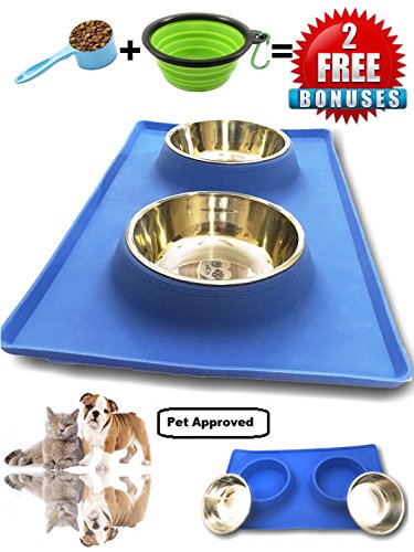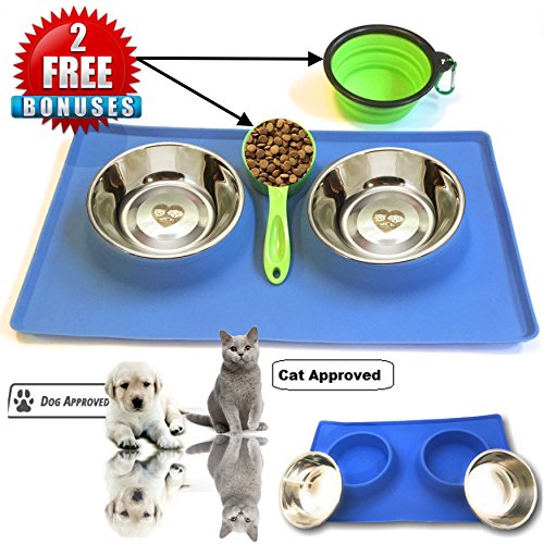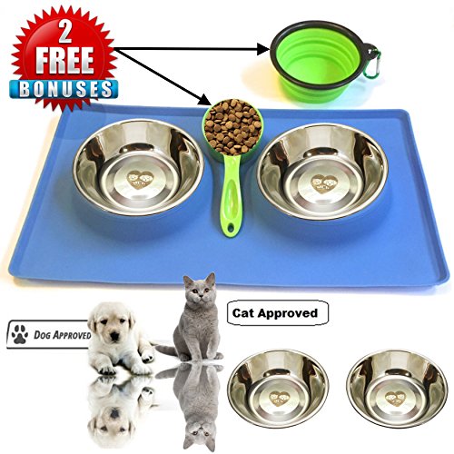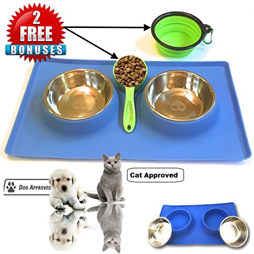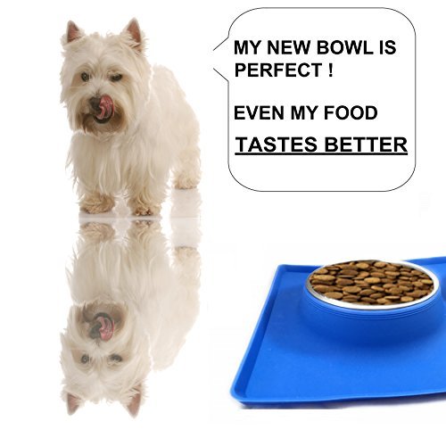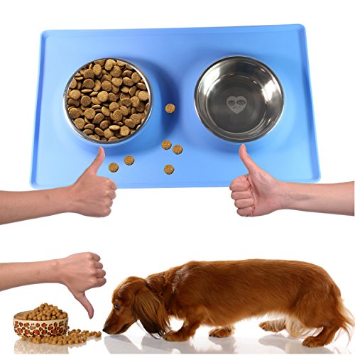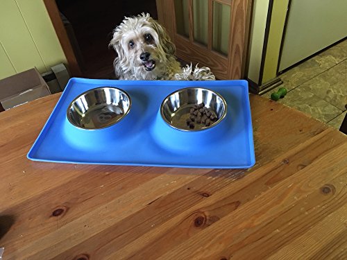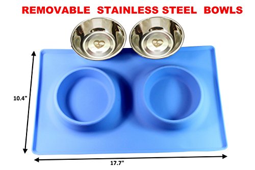 THE SILICONE MAT BOTTOM SKID RESISTANCE keeps the bowls steady and allows your pet to eat and drink easily - no food and water split all over the floor! LARGE BASE RECTANGLE SHAPE of the silicone stand catches any spills. Your floor stays CLEAN. NO MESS to clean up every time you feed them! Feeders are made from TOP QUALITY MATERIALS they are easy to clean . The feeder's silicone and stainless steel construction meets all food safety standards The stainless bowls are also top shelf DISHWASHER SAFE 0 |