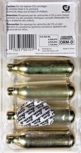 -. Feature : Includes (4) Kleer Drain CO2 Cartridges and (6) Power Disks / No Harsh Chemicals / Safe for the Environment / Uses Naturally Occurring "Food Grade" CO2 / Recyclable