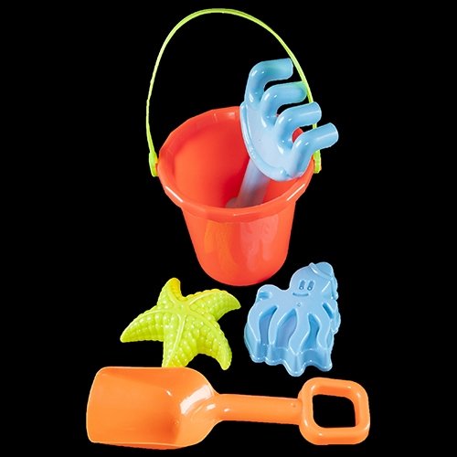 -. Feature : 1 per pack / Plastic 4 inch tall pail includes a 7 3/4 inch shovel and a 6 inch long rake / Plastic 4 inch star fish and 3 1/2 inch octopus for creativity in the sand