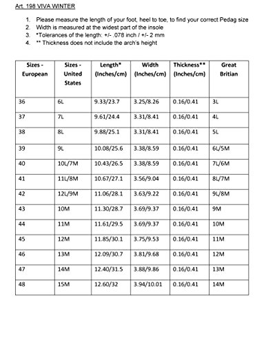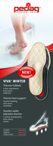 ReleaseDate : 2008-09-15 Studio : Pedag Publisher : Pedag Binding : Health and Beauty Product Description Pedag Viva Winter protects against cold PLUS a full-length orthotic foot bed. Viva Winter is extremely warm yet low profile to fit most winter boots and shoes. Three layers combine to produce highly effective insulation: 1. Top layer is pure wool for comfort against your skin. 2. Middle layer is high tech foam that encapsulates thousands of tiny body heat trapping air bubbles. 3. Bottom layer is made of a NASA type aluminum heat reflector keeps cold from penetrating from the ground and keeps your body heat in. Viva Winter is also an effective orthotic foot support with semi-rigid longitudinal arch and plantar support, metatarsal pad and heel cushion pad. Viva Winter helps prevent and relieve foot conditions such as Plantar Fasciitis and Metatarsalgia, pronation and supination alignment type issues, etc. Viva Winter supports your entire foot and helps prevent fatigue and increases endurance. Increase your enjoyment of skiing, snowboarding, cross-country skiing and building snowmen. Viva Winter has been awarded the American Podiatric Medical Association (APMA) Seal of Acceptance for promoting foot health. 0