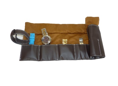 Studio : TIMELYBUYS Publisher : TIMELYBUYS Binding : Office Product Product Description This 6 piece chocolate brown watch case can be used for storage and travel. Leatherette pouch/roll design watch case is elegant and tastefully designed. Features white contrast stitching and velcro closure for added protection. The watch case holds six large watches up to 52mm. 0