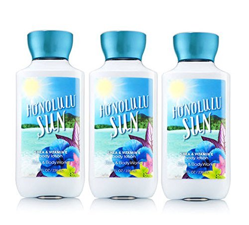 -. Binding : Misc. -. Brand : Bath & Body Works -. EAN : 0652767311051 -. Feature : America's #1 BODY LOTION - Infused with Shea Butter and Daily Moisture Complex / Fortified with protective Vitamin E and conditioning Vitamin B5 / A fast-absorbing, non-greasy formula delivers a 16 hours of continuous moisture / FRAGRANCE: A warm, sun-kissed blend of fresh island coconut, Pacific palm & ocean air / 8 oz (Pack of 3) -. IsAdultProduct : 0 -. Label : Bath & Body Works -. Manufacturer : Bath & Body Works -. MPN : B073TM49QV -. PackageQuantity : 1 -. PartNumber : B073TM49QV -. ProductGroup : Beauty -. ProductTypeName : BEAUTY -. Publisher : Bath & Body Works -. Studio : Bath & Body Works -. Title : Bath & Body Works HONOLULU SUN Shea & Vitamin E Body Lotion, 8 oz (Pack of 3) -. UPC : 652767311051