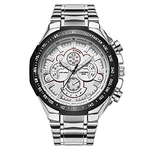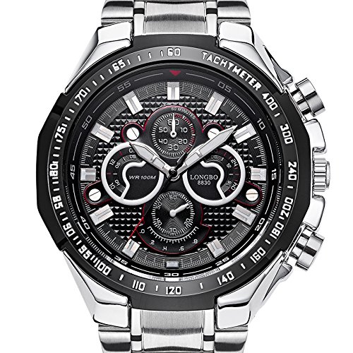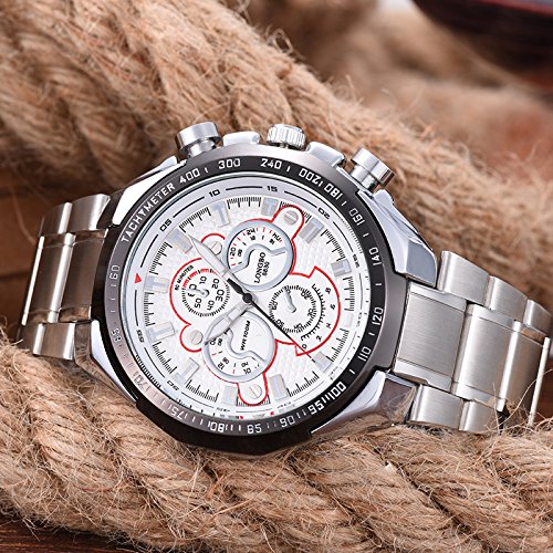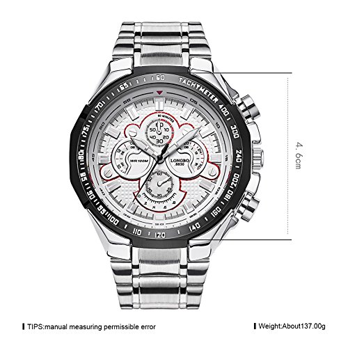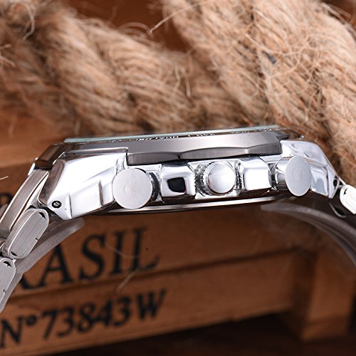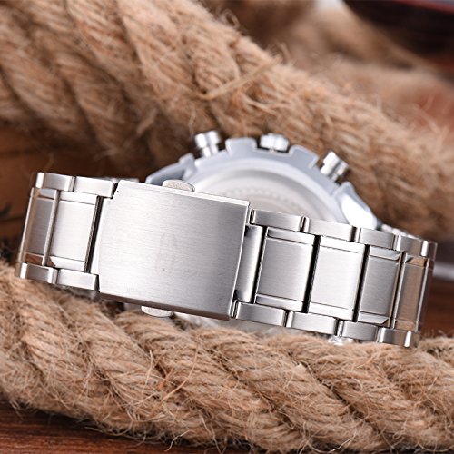 -. Feature : 重厚なビックフェイスデザインでずっしりとした重量感のある腕時計です。 / 本体:重量:56.4g 直径:46mm 厚み:12mm ケース素材:合金 / ステンレスバンド仕様:長さ:24cm 幅:10-19mm 色:シルバー / シンプルなデザインでアウトドアやスポーツにはもちろん、日常生活にもお使い頂けます。 / お仕事でもプライベートでもご使用可能。また勝負時計に大活躍!高級感抜群なので他の人と差をつけることができます