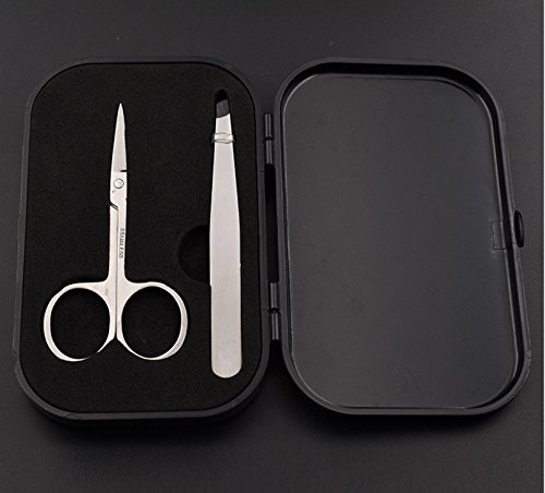 Premium Eyebrow Tweezers and Scissors Set: Pack of 2 with an black hard case, contains slanted tweezer and a pair of sleek stainless steel eyebrow scissors.