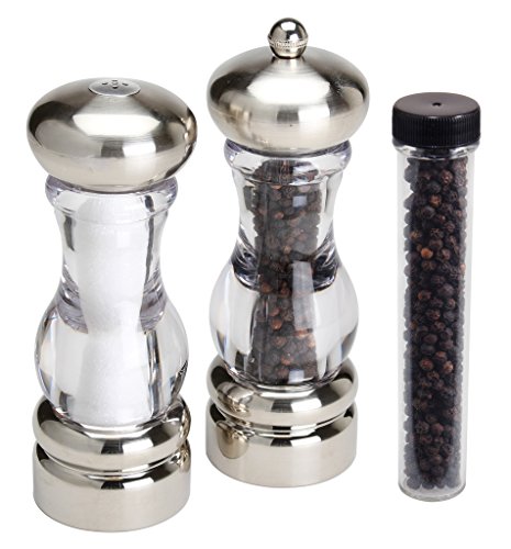 - Acrylic pepper mill and salt shaker set brushed finish top and base