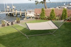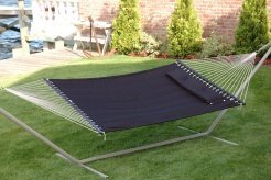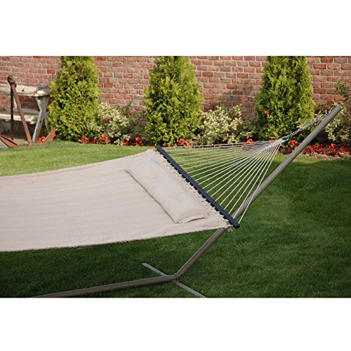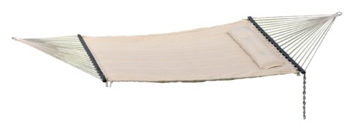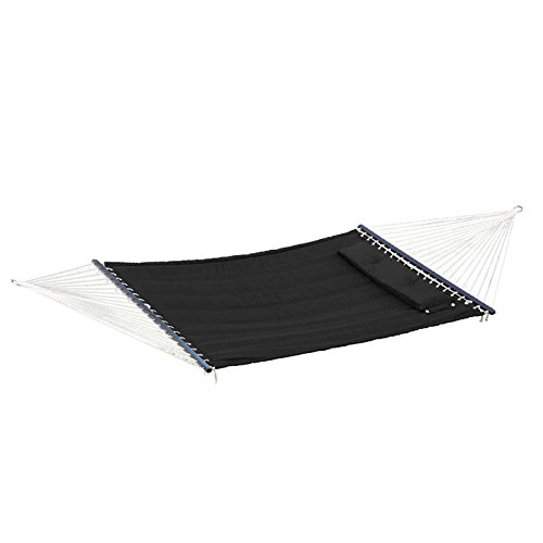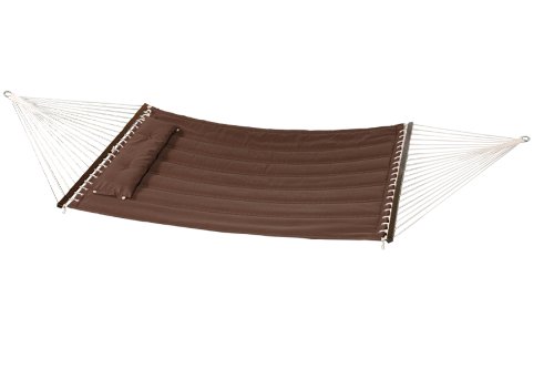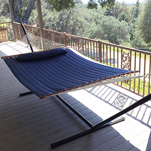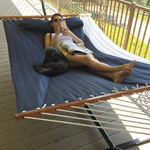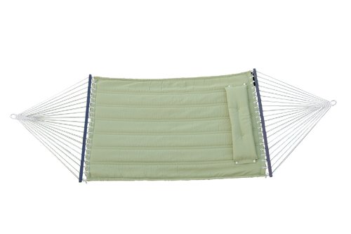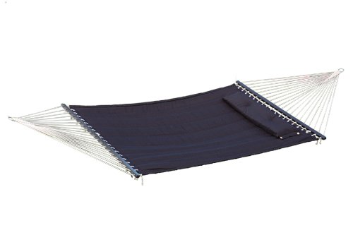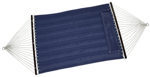 Studio : Bliss Hammocks Publisher : Bliss Hammocks Binding : Misc. Product Description Bliss Hammocks S Stitched Comfort Classic Poly Quilted Hammock combines elegant style and luxurious comfort to create one of the most supremely relaxing hammocks youll find anywhere. The double s stitched quilt contours to your body and keeps the filling in place. Easy-to-clean colorfast polyester fabric is UV and weather resistant for an attractive look that will last. Other premium features include mahogany varnished, non-decaying hardwood spreader bars, an o-ring chain made of rust-resistant steel and a detachable button-tuft pillow for added comfort and ease of use. The Bliss Hammocks S Stitched Comfort Classic Poly Quilted Hammock can hang from any two points strong enough to support a maximum weight of 420 lbs.