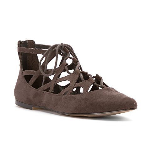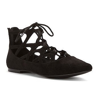 Dressy ballerina flat with geometric cutout accents and a lace up enclosure for a perfect fit. features an alternate rear zipper for easy on/off, lightly cusioned footbed and flexible sole for comfort.