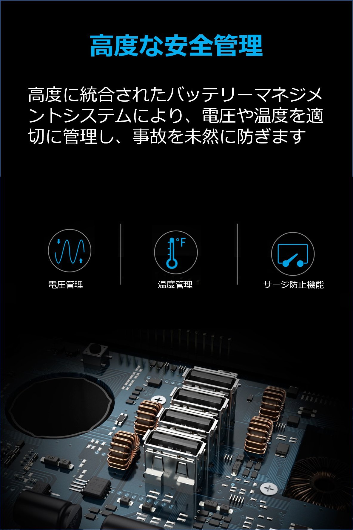 High safety is realized by properly managing voltage and temperature by battery management system (BMS) and preventing short circuit.