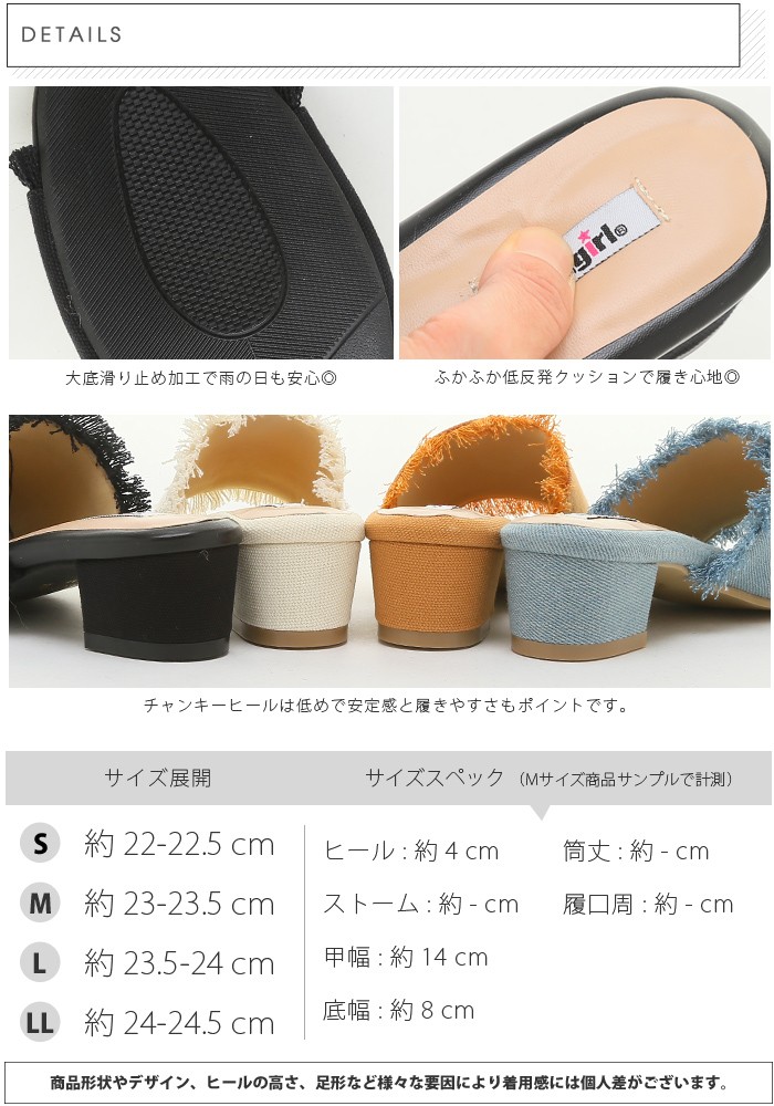 | カラー | 01. ブラックスエード 02. ベージュスエード 03. ピンクスエード 04. デニム |