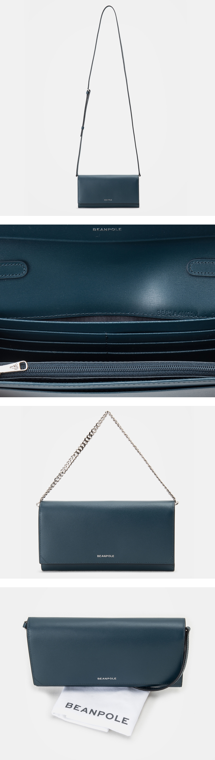 민자 가죽처럼 보이지만 잔잔하게 결이 있는 가죽 소재로 시각적인 효과를 주었으며, 체인과 가죽스트랩 모두 내장되어 투웨이 스타일로 연출이 가능한 장지갑입니다.