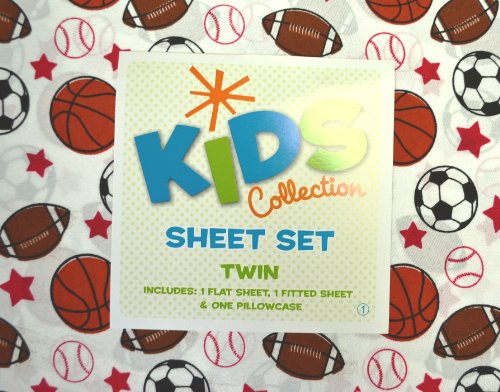 - Feature : Kids Collection Twin sports sheets set comes with 1 flat sheet set 66" x 96", 1 fitted sheet 39" x 75" x 12", 1 standard pillowcase 20" x 30". / Floating on a crisp, white background are sports balls, basketballs, footballs, baseballs, soccer balls and red stars / Perfect set for that lover of all things sports. Pair it with a solid comforter for a comfortable bedding look. / Machine wash in cold water, tumble dry low, remove promptly when dry. No bleach. / Soft Polyester lightweight