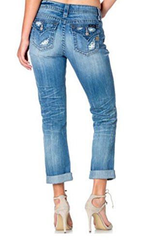 Embellished boyfriend ankle with rhinestone accents and printed peek a boo fabric