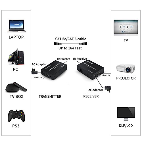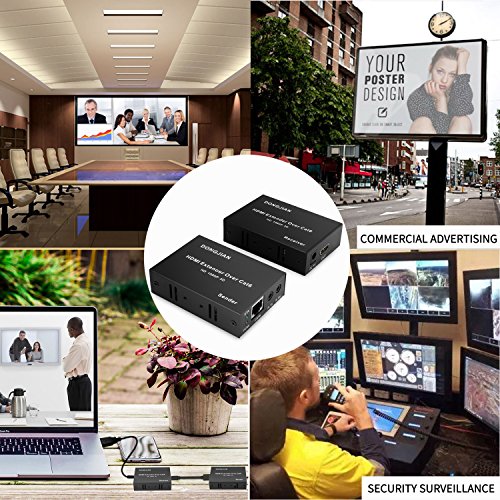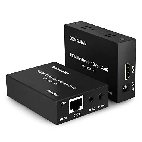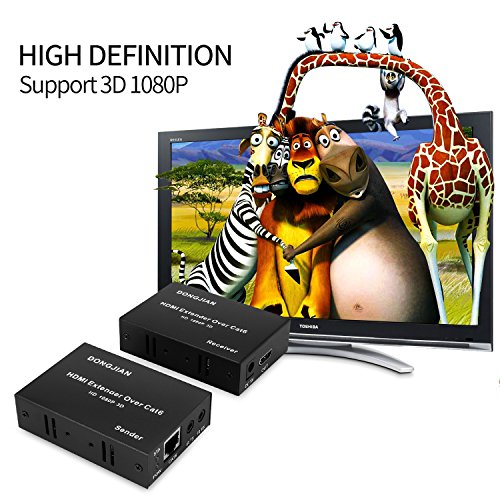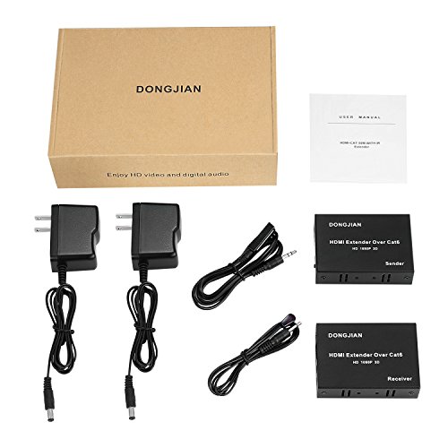 OVERVIEW DONGJIAN HDMI Extender allows high-resolution digital video, including 3D signals, multi-channel digital audio to be sent between devices at distances of up to 164FT (50m)* using low cost CAT6/Cat 5e cable. WHY BUY ME?? This extender uses two modules, one transmitter and one receiver, along with a single power supply. This HDMI Extender allows you to distribute an HDMI signal up to 1080p via Cat5e/Cat6 cable up to 50m to display! FEACTURES: - Extends HDMI signals via Cat5e/Cat6 Cable. - Support for 3D Signals, including 1080p 3D according to HDMI 1.3. -Automatic EDID pass through, delivering crystal clear picture and sound. APPLICATIONS: - Domestic HDMI Matrix System - Video/TV wall display and control - Security surveillance and control - Commercial advertising, display and control - Retail sales and demonstration - University lecture hall, display and control PACKAGE CONTENTS: - 1 X HDMI Extender Premium 1080p 3D, 50m (1* Receiver, 1* Transmitter ) 1 x IR blaster cable 1 x IR receiver cable - 2 X 5V DC 1A Power Supply - 1 X User Manual