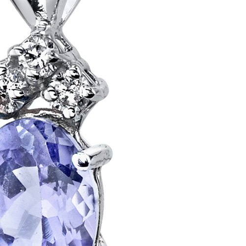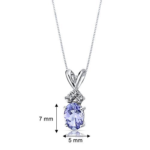 Gemstone: Genuine Tanzanite Oval Cut, 7 x 5 mm, 0.75 carats, Bluish Purplish Hue with Brilliant Sparkle. 0.06 carat genuine Diamond with G-H color and SI1-SI2 clarity. Pendant: 0.78 grams pure 14k White Gold with 14k stamp. Pendant feature exceptional Design, Craftsmanship and finishing. Perfect gift for Mothers Day, Birthdays, Valentines Day, Graduation, Christmas or just about any other occasion. Money Back Guarantee. Includes a Signature Gift Box. Includes matching 18 inch Sterling Silver Rhodium Finish Box Style Chain. Style P9340Feature