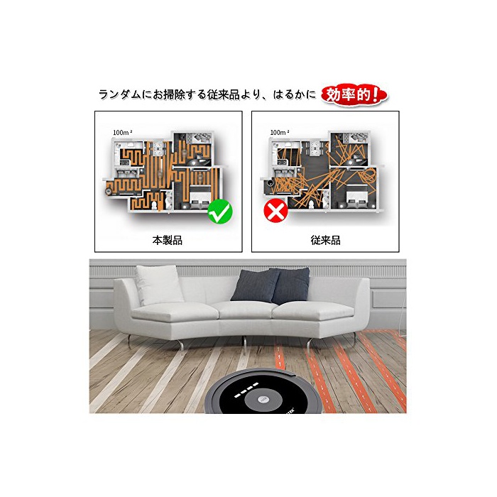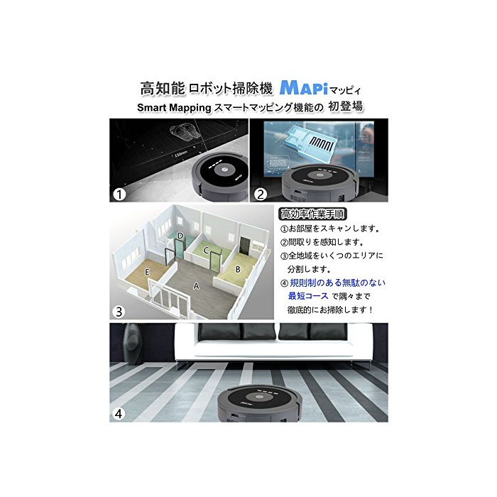 【고지능 고효율】《맛피》(MAPi) 서는 스마트 mapping(Smart Mapping)기능을 탑재한 로보트 청소기입니다.방을 스캔 하고, 방의 배치를 감지하고, 전지역을 몇 개의 에리어에 분할하고, 규칙이 있는 낭비이 없는 최단 코스에 구석구석까지 철저하게 청소 합니다!랜덤으로 청소 하는 종래품에서,훨씬 효율적! ※제품 보증기간:1년간