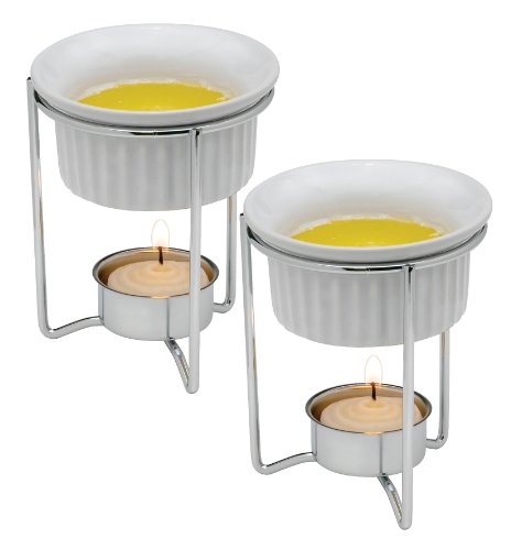 HIC 's White Ceramic Butter Warmers with Tealight Stands are designed to keep melted butter warm. Set includes two 3-ounce ceramic ramekins, two tealights and two stainless steel stands. Ramekins are dishwasher and microwave safe. Simply fill ramekins half way with butter. Place in microwave for a few seconds to partially melt the butter. Carefully place ramekins in the stands and light the tea lights. Keeps butter warm and melted. Use for seafood, corn on the cob, serving sauces, dips and fondues.Feature