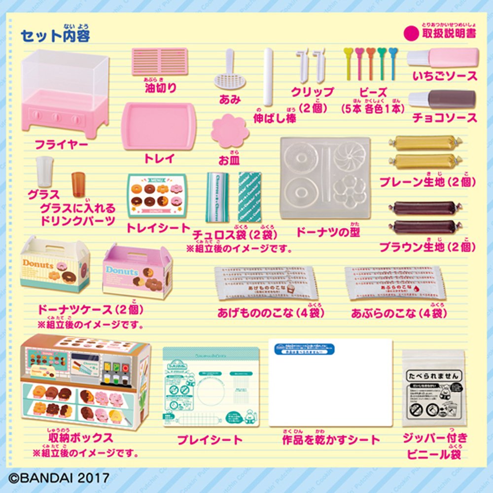 Strawberry sauce, chocolate sauce, plain cloth (2 pieces), brown cloth (2 pieces), rice cakes (4 bags), donut case (2 pieces), churos bag (2 pieces), beads (1 piece each)