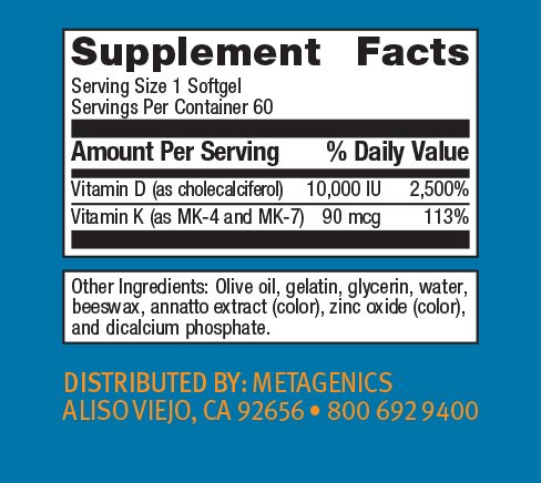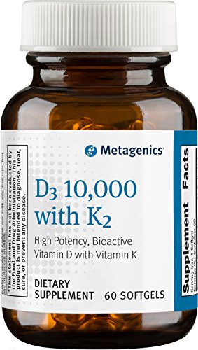 D3 10,000 with K2 provides 10,000 IU per softgel of vitamin D (as D3), designed for greater absorption. This high potency formula also includes bioavailable forms of vitamin K2 to complement vitamin D.