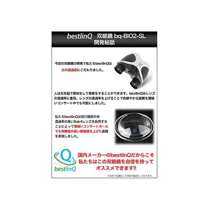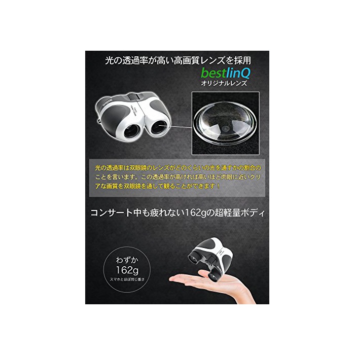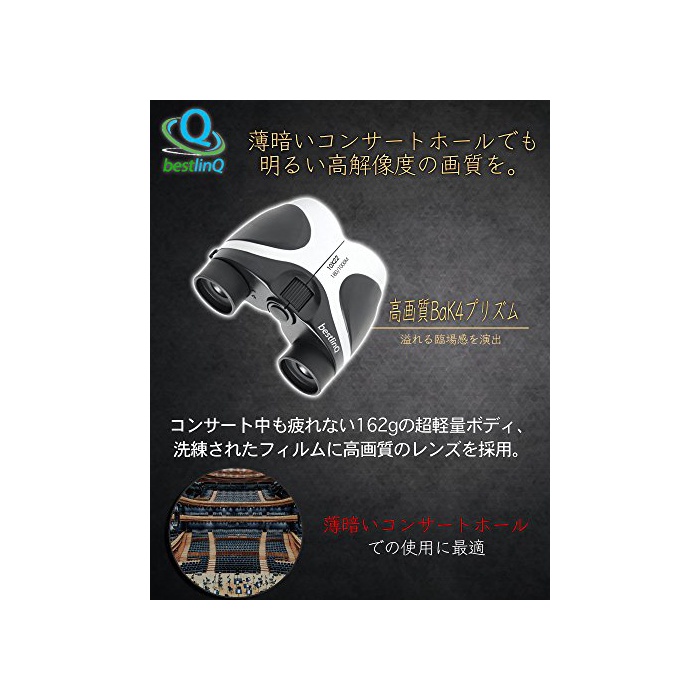 침침한 콘서트 홀에서도 명쾌한 화질을】:bestlinQ 쌍안경bq-BIO2-SL은 침침한 콘서트 홀에서도 밝게 클리어인 화질을 실현 할 수 있었습니다. 쌍안경을 통해 스테이지를 보면 시야가 어두워져 끝 스테이지가 잘 안보이다….그렇지만,육안이면 스테이지가 먼 때문에,할 수 있으면 쌍안경에 스테이지를견 대…. 이라고 하는 콘서트 씬의 딜레마를 bestlinQ 쌍안경bq-BIO2-SL은 해결합니다.bestlinQ 쌍안경bq-BIO2-SL은 폴로 프리즘식 광학 배율10배 BaK4프리즘초 경량162g이라고 하는 오름 스펙에 콘서트 씬 이외의도 사용할 수 있는 콘서트 씬으로 특화 한 만능형 쌍안경입니다.