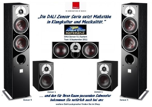 -. Feature : Dali Zensor 5.0-Kanal Lautsprechersystem, Farbe Black Ash, bestehend aus: / Frontlaustsprecher 2 x Dali Zensor 5, Center-Lautsprecher Dali Zensor Vocal, Rear-Lautsprecher 2 x Dali Zensor 1