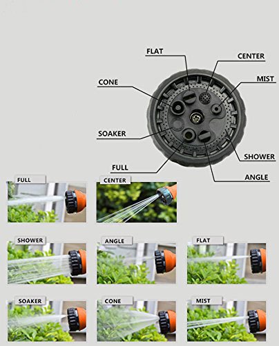 - 8 Types Watering Modes: 8 types watering patterns: Flat, cone, soaker, full, angle, shower, mist, center. Turn the spray nozzle dial to choose appropriate pattern you like. Built-in shut-off brass valve saves you endless trips to the faucet. ON/OFF valve located on the end for convenient use.