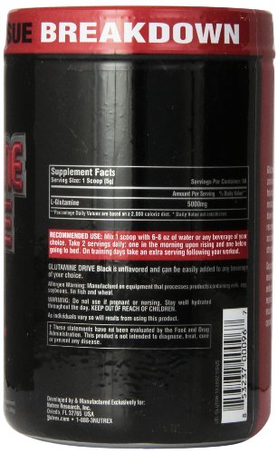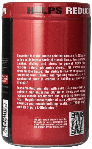-. Binding : Health and Beauty -. Brand : Nutrex -. EAN : 0853237000967 -. Feature : Glutamine is a vital amino acid that accounts for 60% of all amino acids in the body -.Glutamine drive can be used to supplement the l-glutamine that is depleted in your body during intense workouts and help with muscle repair -.Regular consumption of l-glutamine can improve training results -. IsAdultProduct : 0 -. Label : Nutrex Research -. Manufacturer : Nutrex Research -. Model : NX51 -. MPN : NX51 -. NumberOfItems : 1 -. PackageQuantity : 1 -. PartNumber : NX51 -. ProductGroup : Health and Beauty -. ProductTypeName : HEALTH_PERSONAL_CARE -. PublicationDate : 2013-12-07 -. Publisher : Nutrex Research -. ReleaseDate : 2013-12-04 -. Size : 0.8000 -. Studio : Nutrex Research -. Title : Nutrex Research Glutamine Drive Supplement, 300 Gram -. UPC : 853237000967