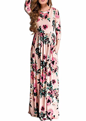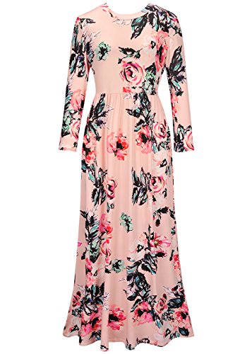 Women's Long Sleeve Crew Neck Floral Print Maxi Dress Ankle Length Pink M