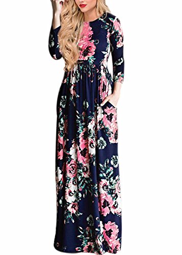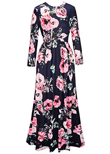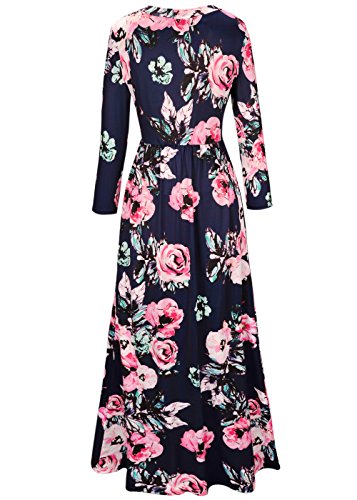 WWomen's Summer Casual Floral Printed Long Sleeve Empire Flower Maxi Dress Navy L